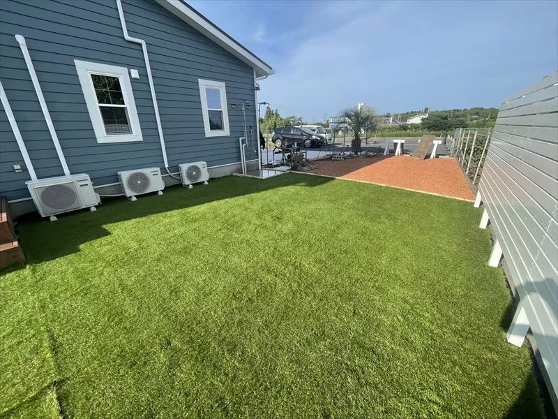 当社オリジナルの「超リアル人工芝」は、天然芝に近い見た目と手触りを持ち、遮熱性やクッション性、透水性に優れています。これにより、草引きや芝刈り、水やりといった手間を省きながら、美しい緑の庭を維持できます。個人宅はもちろん、幼稚園や保育園、介護施設などでも多数の施工実績があります。
